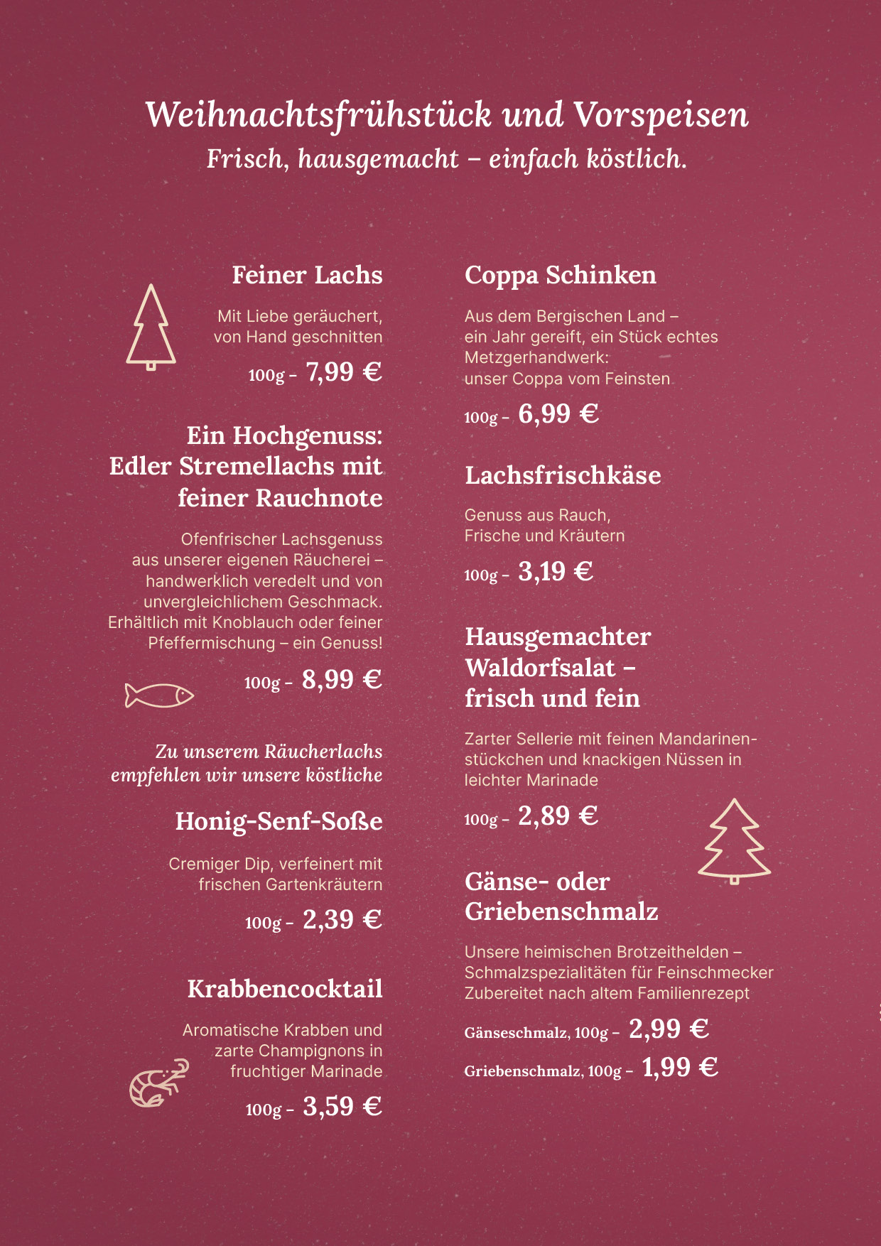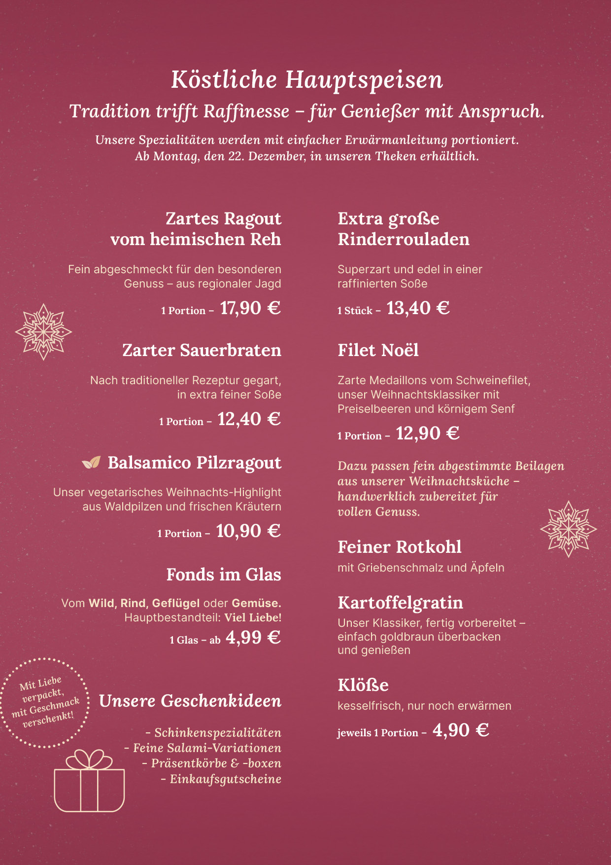 Freuen Sie sich auf eine himmlische Auswahl feinster weihnachtlicher Spezialitäten, sorgfältig für Sie zusammengestellt.